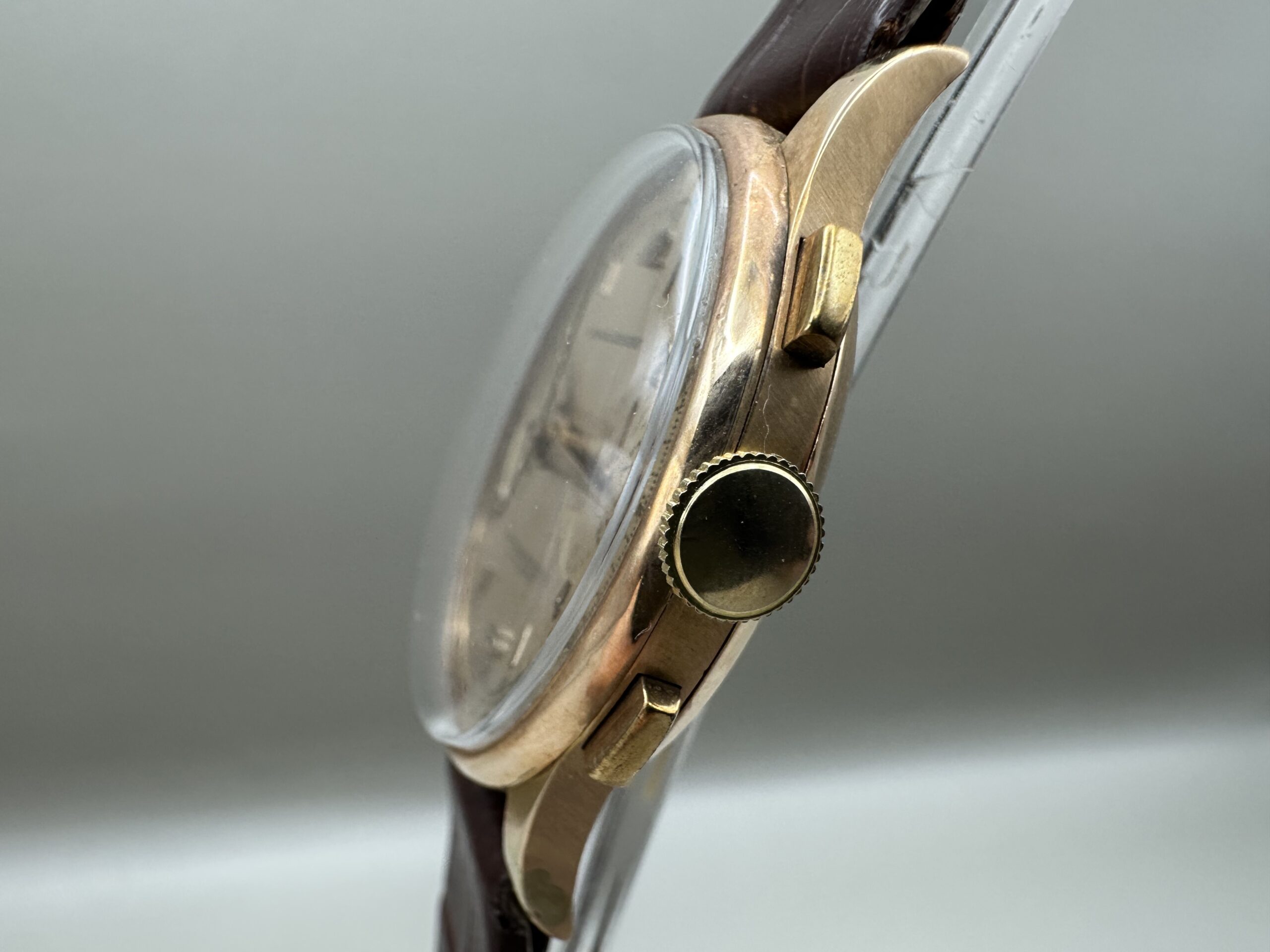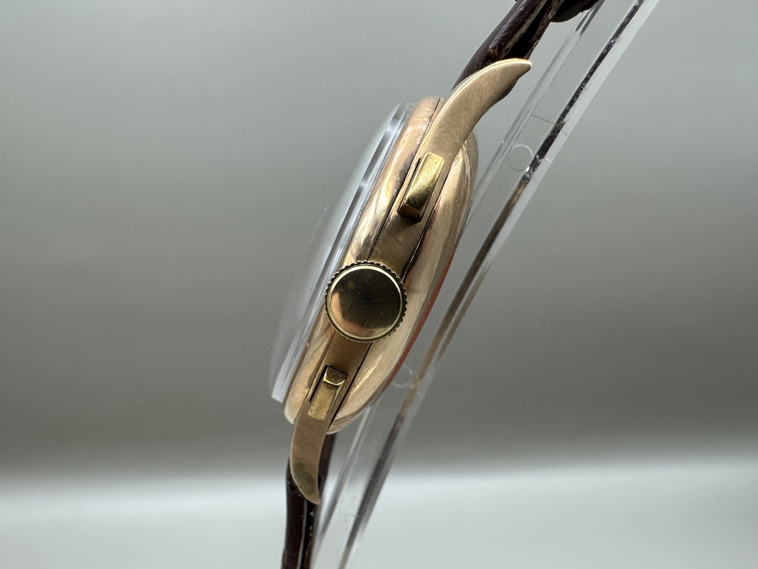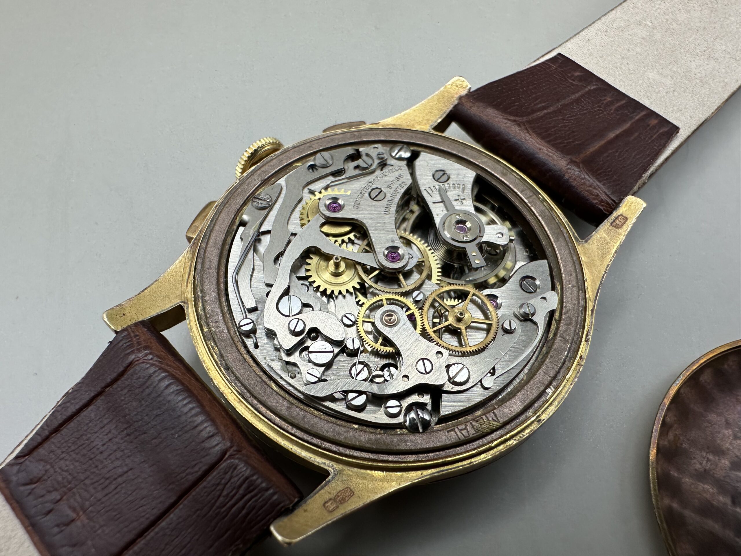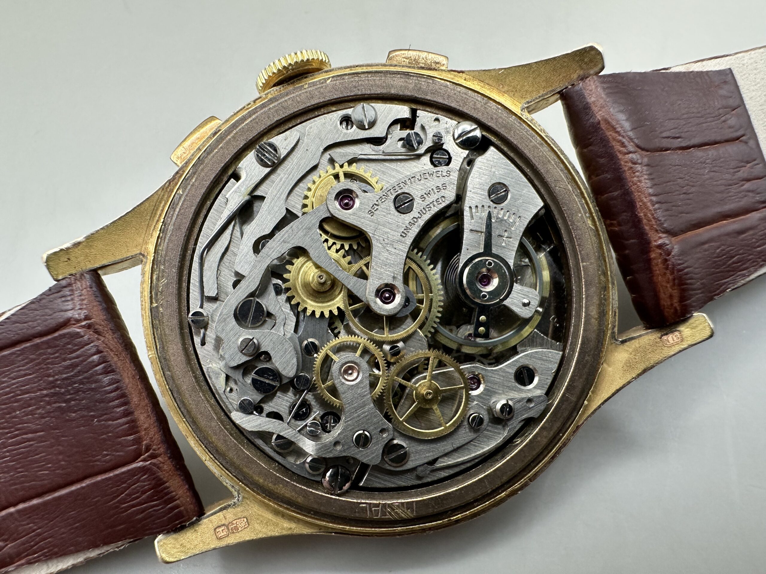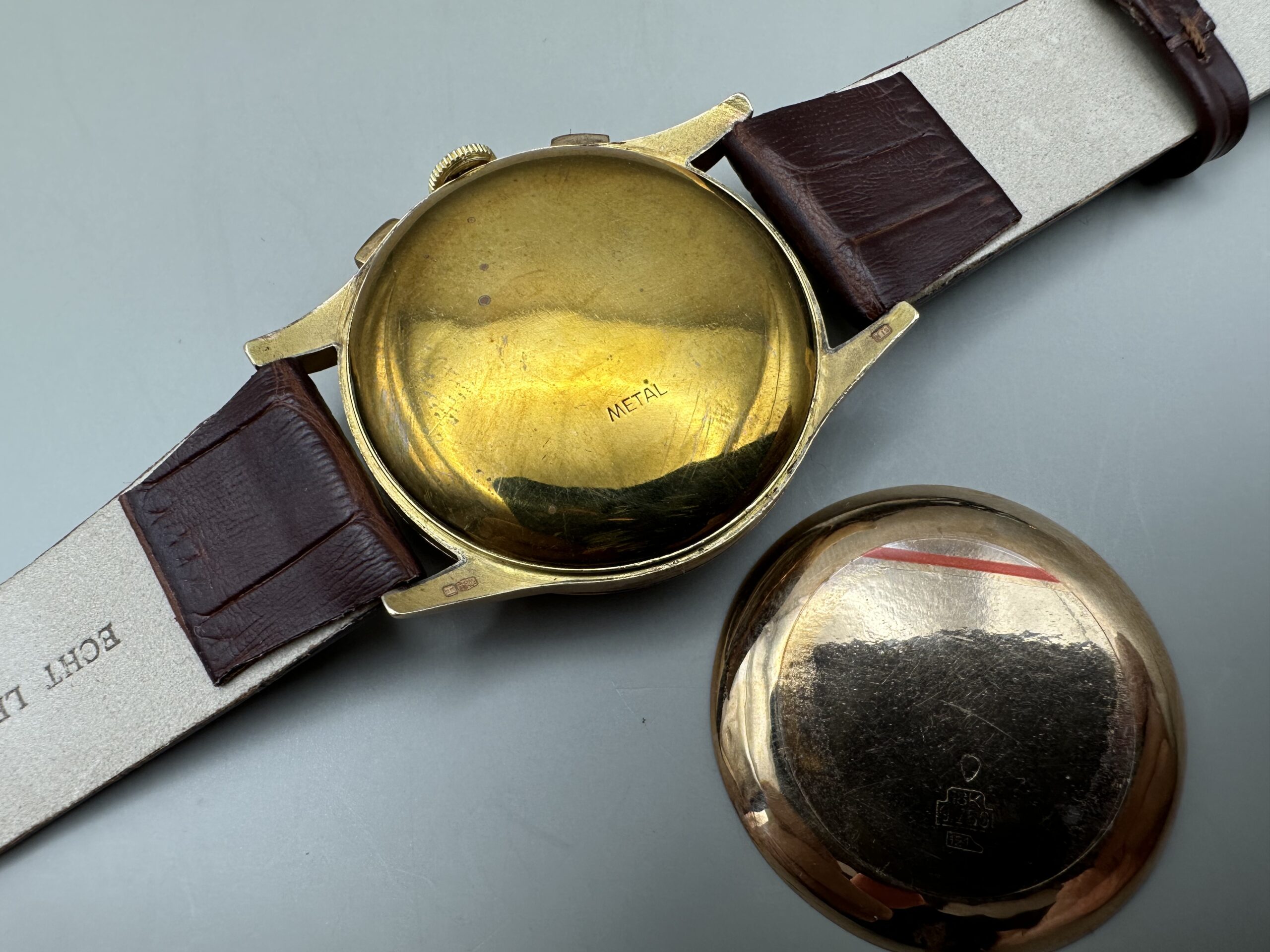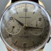 18K rose gold Henglebert made in the 1950s. Landeron caliber 51 manual winding mechanical stopwatch movement.